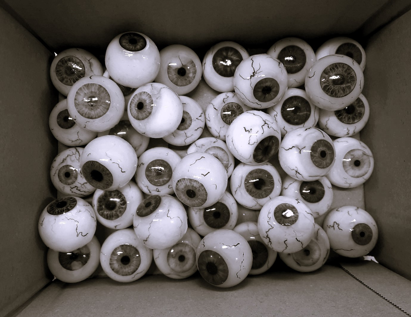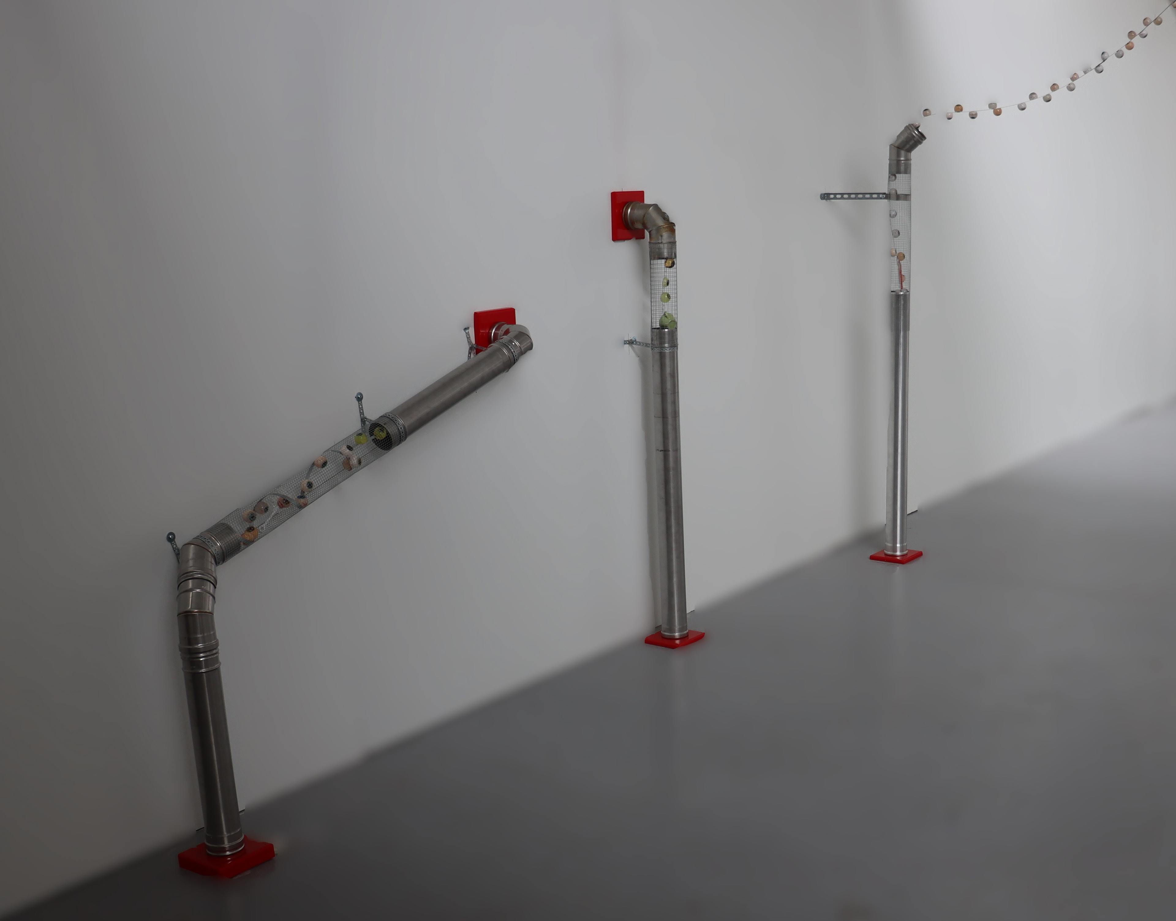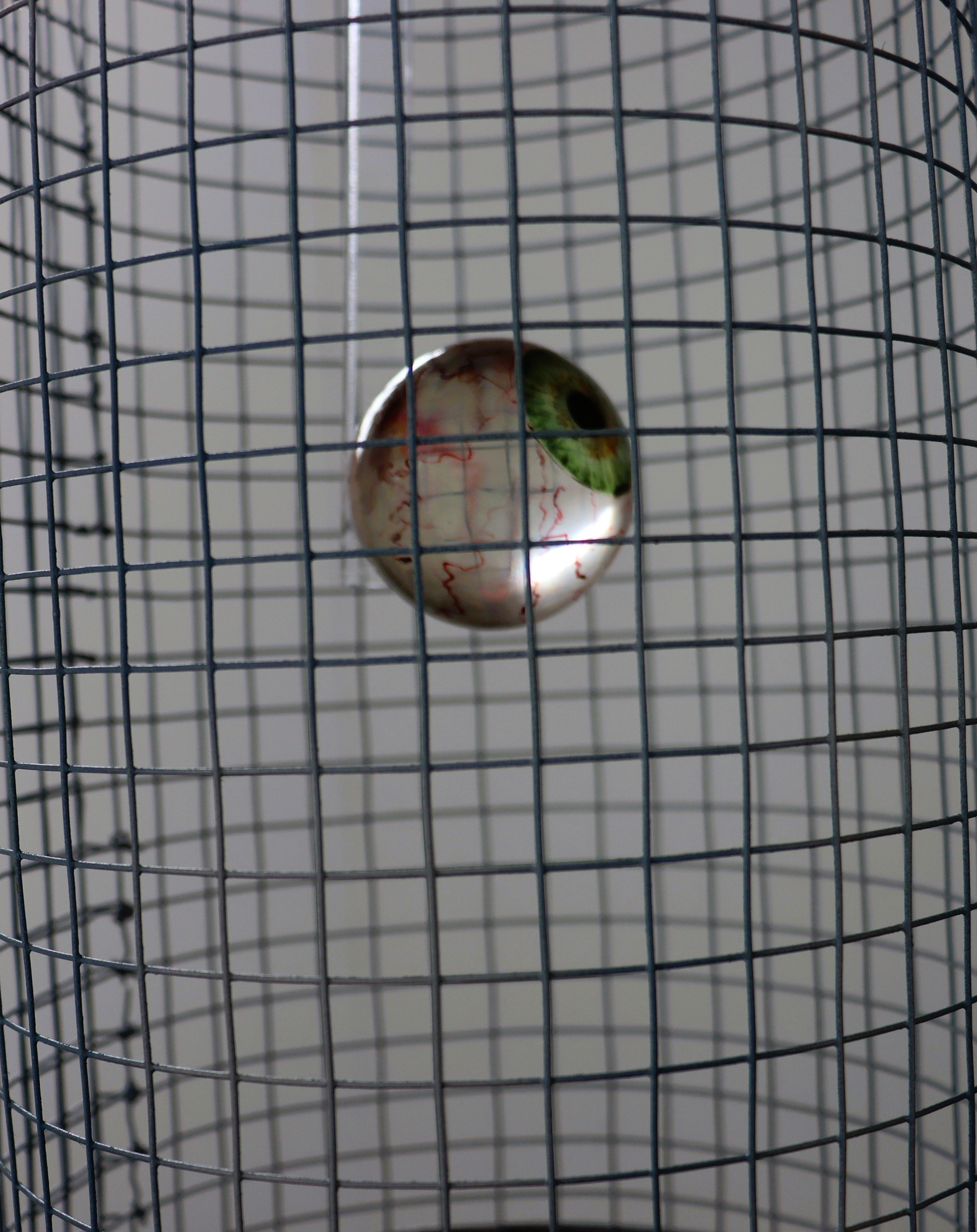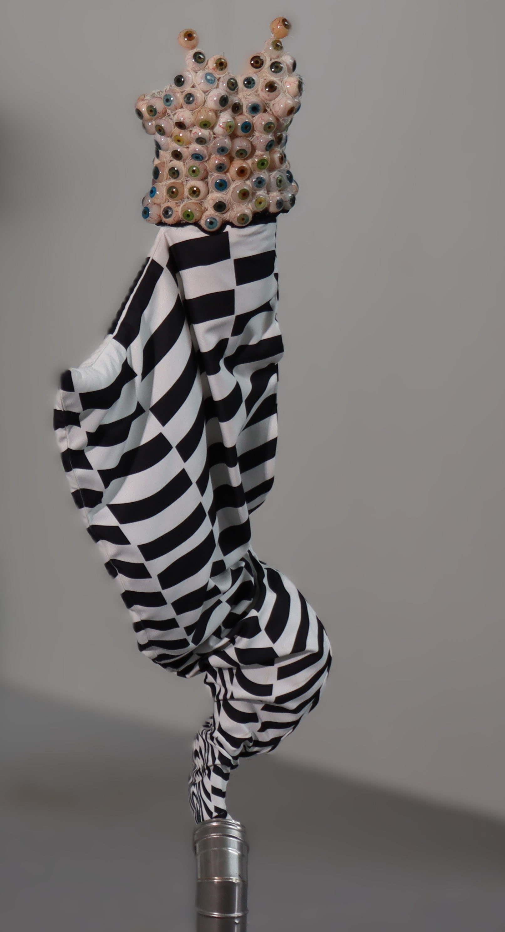 An assemblage of steel ducting, textiles, resin, and repurposed objects in this work explores identity, the body, and the social norms that shape who we are. Hundreds of cast resin eyeballs, associated with the body, speak to a multiple of ways we see and are seen.