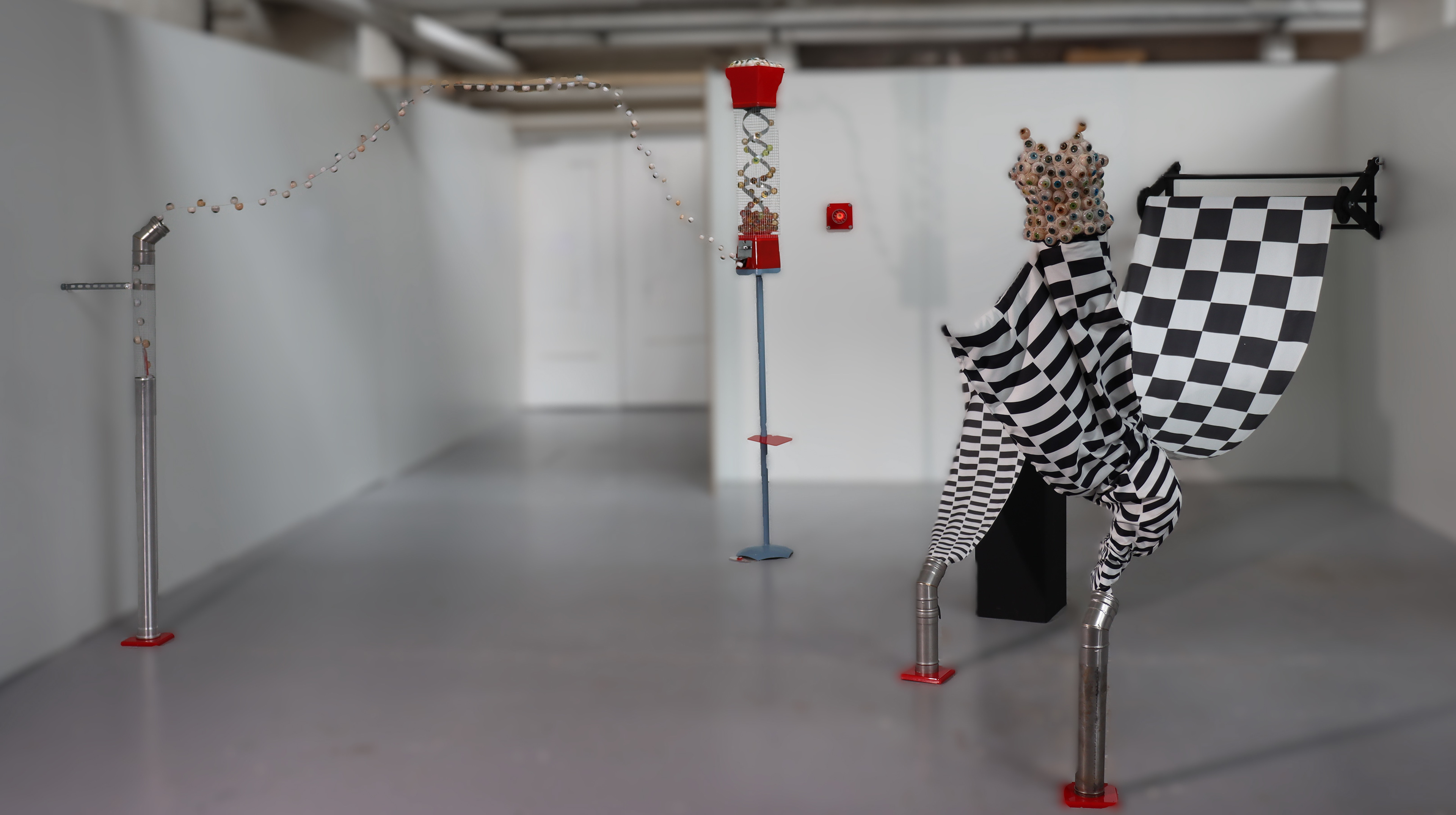 The use of stark black-and-white chequered pattern contrasts with the softness of sweeping fabric and padded textile forms. The use of hard steel piping, construction fixings and mesh combine with the soft textile elements to create space for a conversation about life journey, inherited roles and personal transformation.